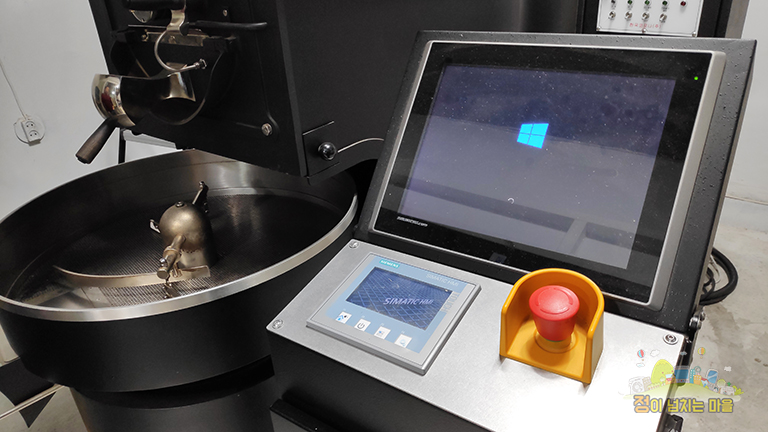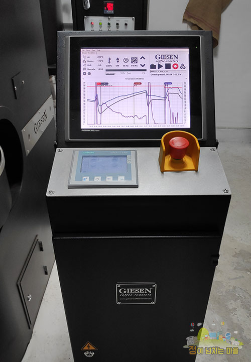 로스터기는 대용량을 볶아낼 수 있는 기센의 제품이었고 생각보다 큰 크기에 놀랐습니다. 하물며 전혀 생각하지 못했던 모니터가 달린 컨트롤 시스템이 보였고 이는 볶는 기술에 있어 각자 바리스타의 노하우를 그리는 생각을 그대로 적용하기 위한 시스템이라고 합니다.