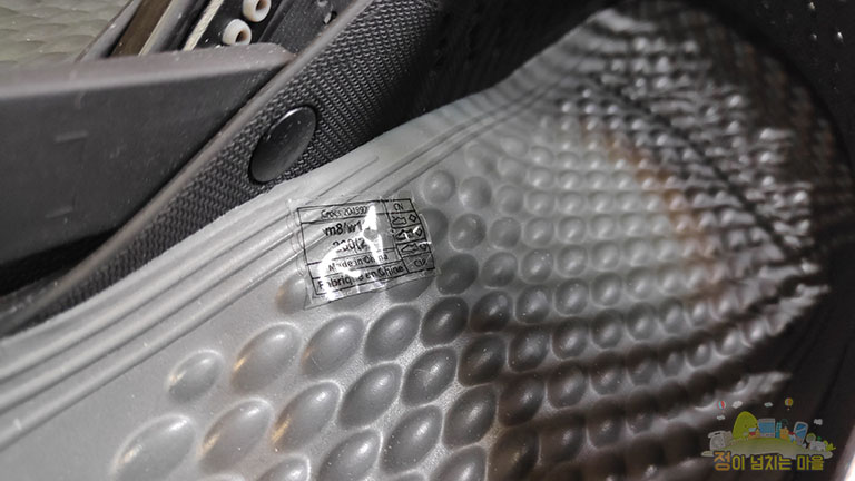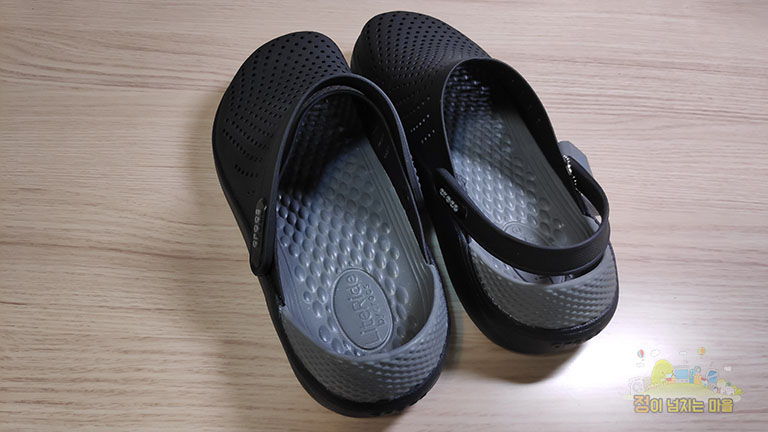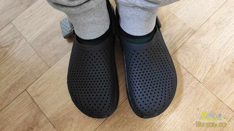 착용샷을 다양한 각도로 찍질 못해 본 모델의 특징이 전부 나타나지 않았습니다. 실제로는 크록스가 디자인에 큰 변화를 주었구나라고 느낄 정도로 제법 세련됐다는 판단이 섭니다. 다만 검정 색상은 심플함이 강해 자칫 단순해 보일 수 있으나 식구들이 신은 타 색상 모델을 보니 특징이 더욱 부각되어 보였습니다.