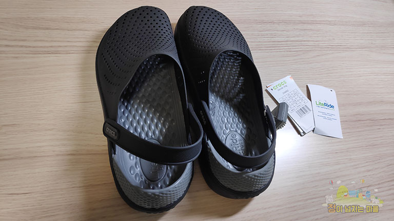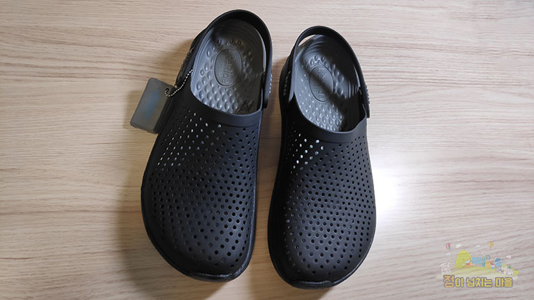 착용샷을 다양한 각도로 찍질 못해 본 모델의 특징이 전부 나타나지 않았습니다. 실제로는 크록스가 디자인에 큰 변화를 주었구나라고 느낄 정도로 제법 세련됐다는 판단이 섭니다. 다만 검정 색상은 심플함이 강해 자칫 단순해 보일 수 있으나 식구들이 신은 타 색상 모델을 보니 특징이 더욱 부각되어 보였습니다.