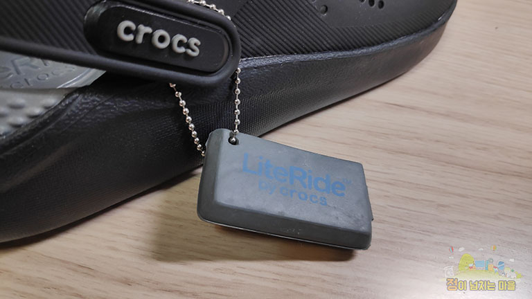 신발 재질과 동일한 고무 상품 택도 달려 있더군요. 뭔가 신발과 관련하여 기능적인 부분이 있을 까 싶어 검색해 보았더니 다른 의미는 없었습니다. 특이한 상품 택 정도랄까요.