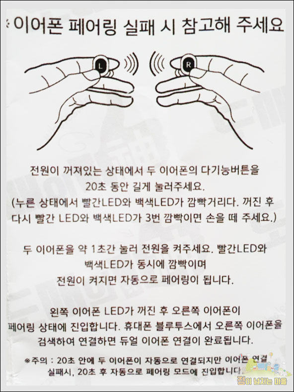 제조사에서 설명하고 있는 QCY T1 초기화 방법 입니다. 설명서를 겨우 찾아 찍어 봤네요.