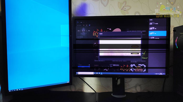 좌측에 확장 모니터의 전원을 OFF 했을 경우 위 사진에서 보시다시피 메인 모니터는 검은 줄이 생기면서 깜박 거리기 시작했습니다. 물론 별도로 끌 필요 없이 윈도 창키 + P를 눌러 상단 'PC 화면만' 아이콘을 클릭하면 확장 모니터의 전원이 차단됩니다.