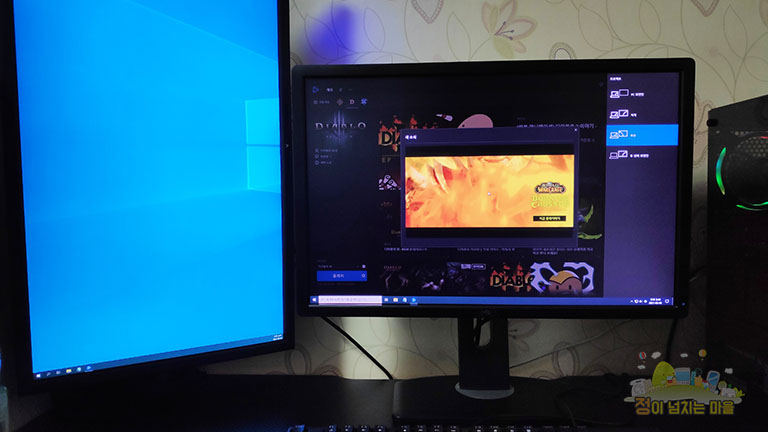 좌측에 확장 모니터의 전원을 OFF 했을 경우 위 사진에서 보시다시피 메인 모니터는 검은 줄이 생기면서 깜박 거리기 시작했습니다. 물론 별도로 끌 필요 없이 윈도 창키 + P를 눌러 상단 'PC 화면만' 아이콘을 클릭하면 확장 모니터의 전원이 차단됩니다.