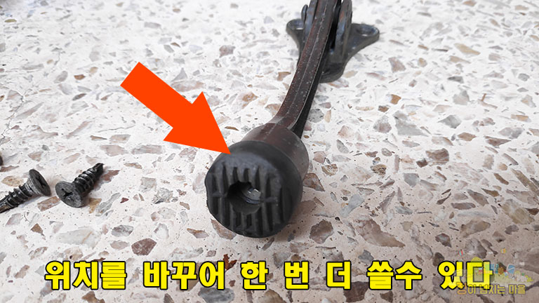 사진에서 처럼 집 안쪽으로 향하는 고무가 닳아 있습니다. 따라서 바닥과 닿는 면의 마찰력이 줄어 문을 고정시키지 못하고 서서히 닫히게 되는 것이지요. 바로 이 녀석의 위치를 반대로 바꿔 주어 새것처럼 기능을 살려낼 수 있습니다.
