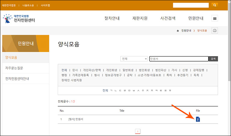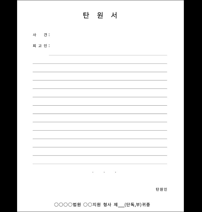 인터넷에 공개된 탄원서 양식은 저마다 조금씩 다르더군요. 물론 형식에서 크게 벗어나지 않는 것 같아 아무거나 써도 상관은 없을 것 같았지만 대한민국법원 전자민원센터에서 공식 탄원서를 다운로드 받을 수 있어 이를 프린트하여 탄원서를 작성하기로 했습니다.