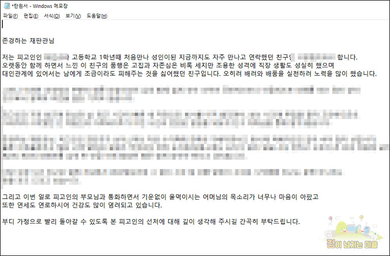피고인과의 관계 설명을 시작으로 메모장에 우선 타이프하여 써놓은 탄원서 예시 초안 모습입니다.