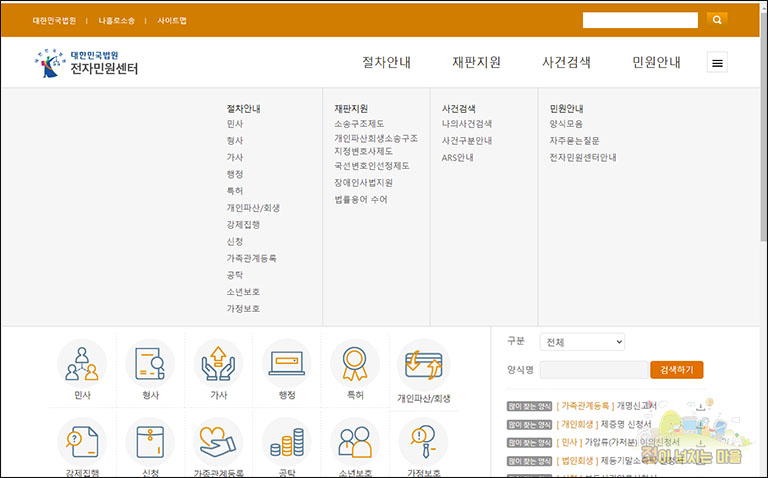 그러면 양식모음 화면이 나타나며 관련한 모든 양식을 내려받을 수 있습니다. 우리는 탄원서가 필요해서 왔으니 탄원서를 검색하여 줍니다. 그러면 아래아 한글로 만들어진 탄원서 양식을 내려받을 수 있는 아이콘이 나타납니다.